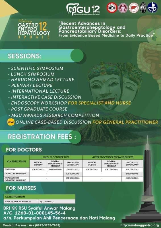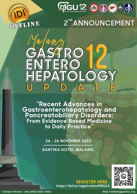 Division of Gastroenterology, Departement of Internal Medicine, Faculty of Medicine Universitas Brawijaya-Saiful Anwar Hospital proudly present Malang Gastroenterohepatology Update (MGU)-12 “Recent Advances in Gastroenterohepatology and Pancreatobiliary: From Evidence Based Medicine to Daily Practice” will be held on November 24th-26th, 2023 at Santika Hotel Malang.