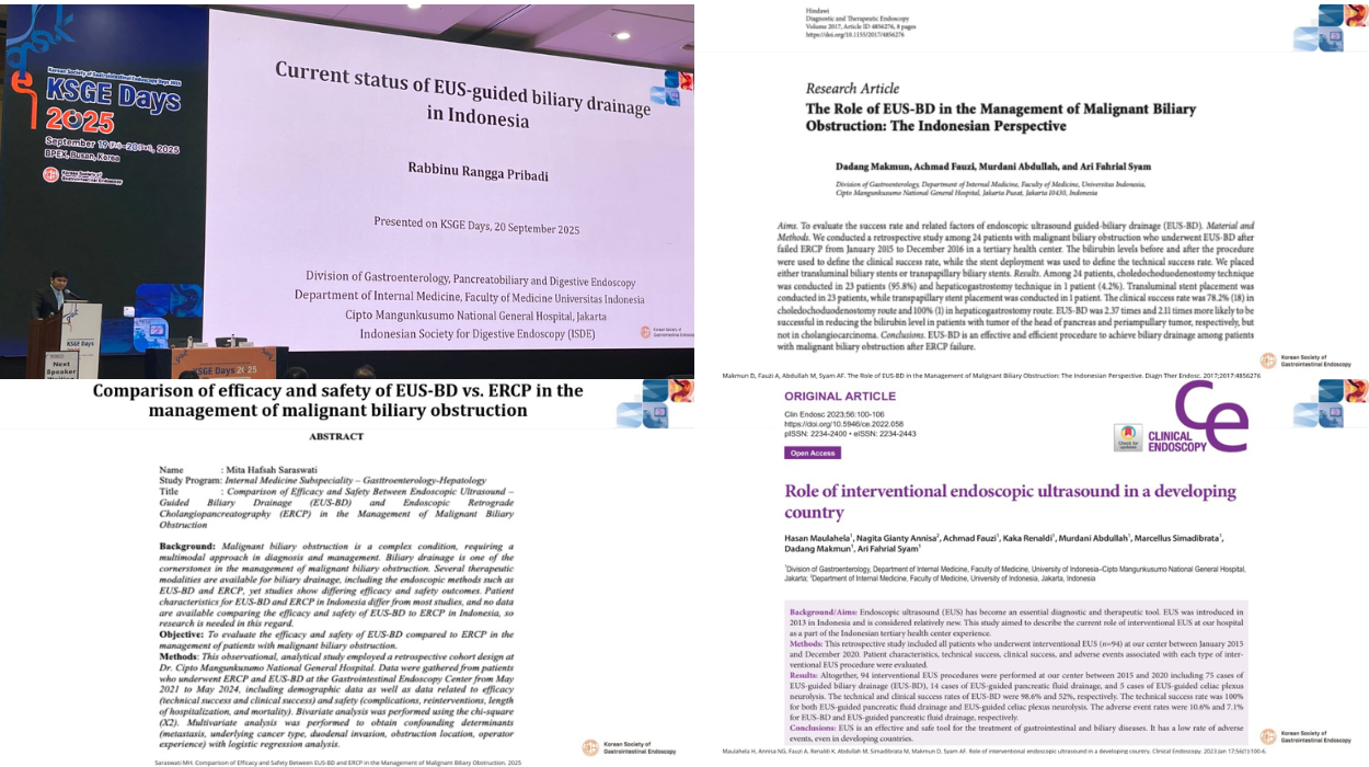 Selain itu, dr. Rabbinu juga tampil sebagai pembicara dengan topik “Current status of EUS-guided Biliary Drainage in Indonesia“. Dalam presentasinya, dr. Rabbinu juga melaporkan hasil publikasi Prof. Dadang Makmun, dr. Achmad Fauzi, dr. Hasan Maulahela, dan dr. Mita Hafsah mengenai EUS-BD.