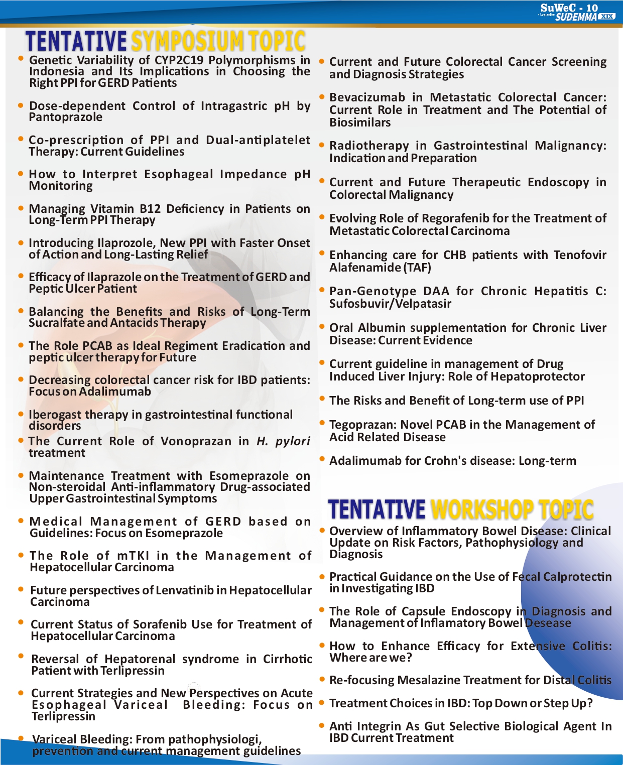 Workshop dan Simposium ini diselenggarakan oleh Divisi Gastro-Enterologi Hepatologi Departemen Ilmu Penyakit Dalam Fakultas Kedokteran Airlangga- RSUD Dr. Soetomo Surabaya dan Perhimpunan Peneliti Hati Indonesia- Perkumpulan Gastroenterologi Indonesia- Perkumpulan Endoskopi Gastrointestinal Indonesia (PPHI-PGI-PEGI) Cabang Surabaya.